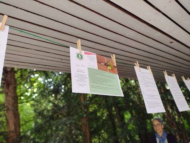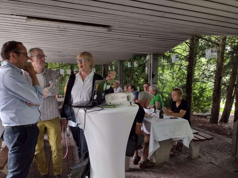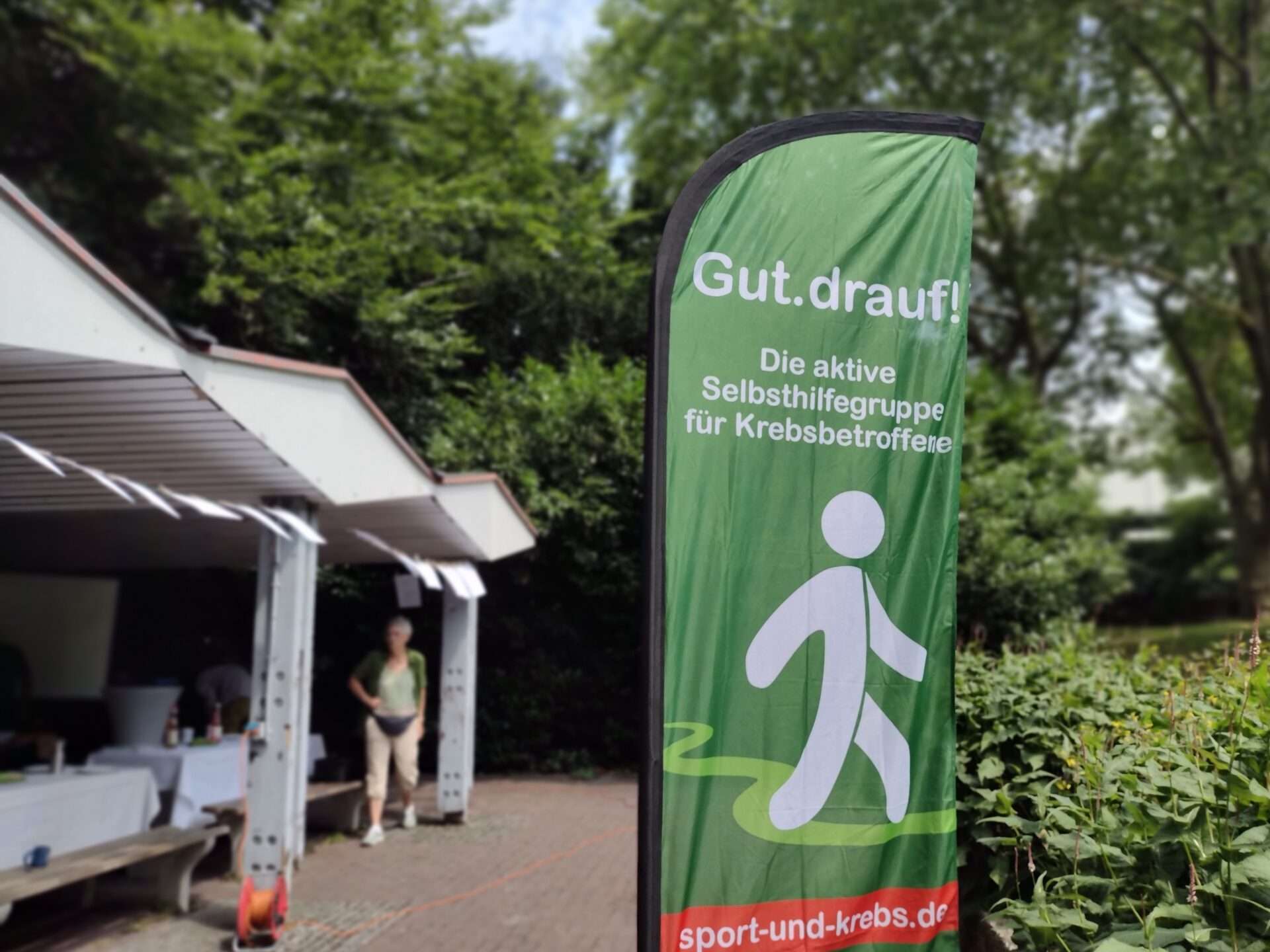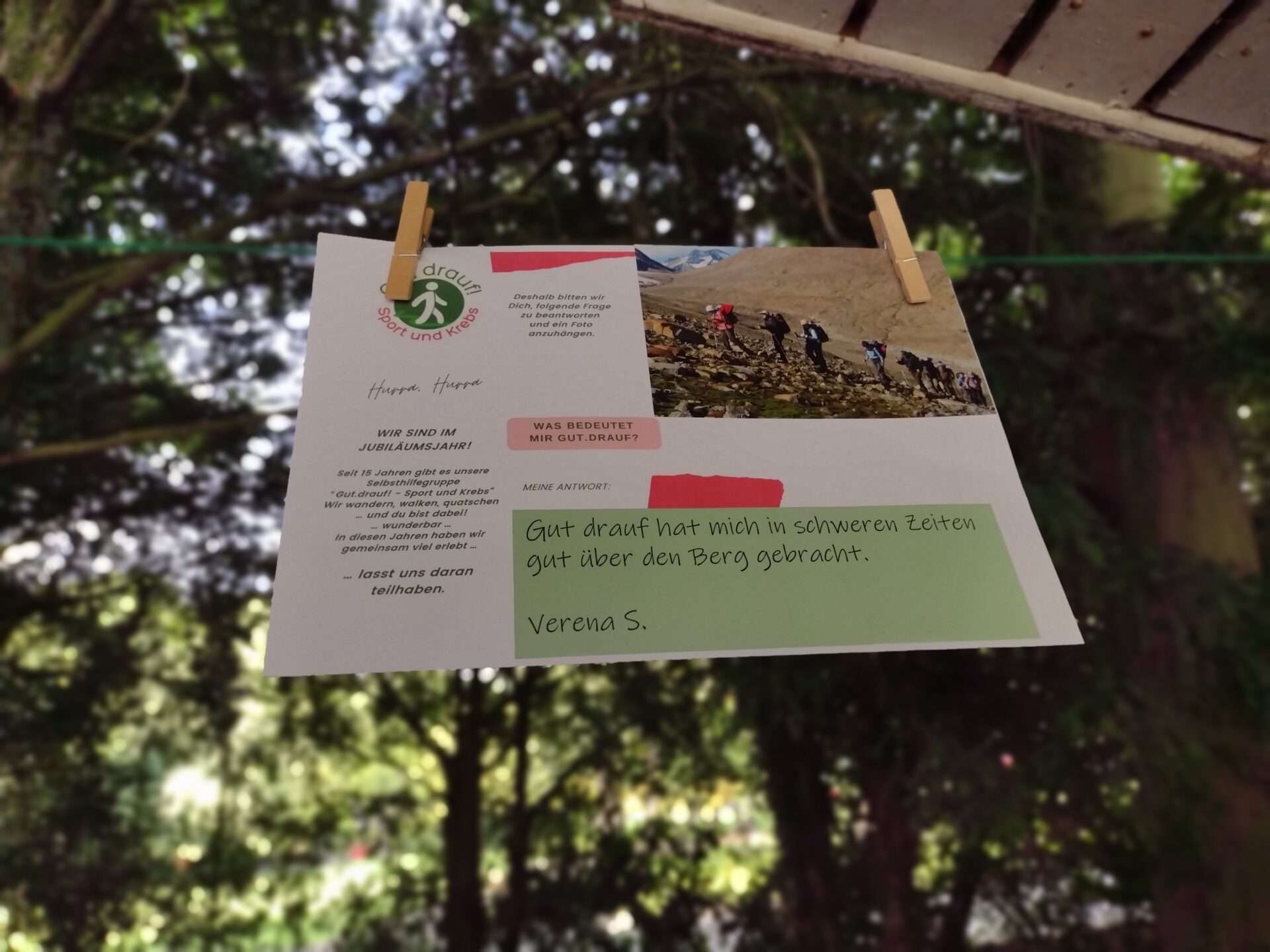 Den Grillplatz hatten wir entsprechend hergerichtet. Die Beachflag wies schon von weitem den Weg. Rund um die Sitzplätze hatten wir eine Schnur gespannt, an der auf zahlreichen Blättern unsere Aktivitäten aus 15 Jahren aufgelistet waren, unsere Wanderungen, Teilnahmen an Sportveranstaltungen, Wanderurlaube, Ausflüge usw. Dann hatten wir im Vorfeld bei uns gefragt, “Was bedeutet Dir Gut.drauf?”. Die Antworten wurden auf Jubiläumskarten gedruckt und zwischen unsere Aktivitäten Blätter gehängt. Dann gab es noch eine Leinwand, auf wir in Endlosschleife fast 400 Bilder aus unserer Zeit als Diashow liefen.